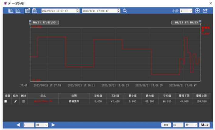 フロー図上の任意の計測点データをクリックすると、そのポイントデータのトレンド分析が表示されます。ユーザーは必要に応じて過去の任意の期間における履歴曲線を照会でき、さらなる最適化調整に役立てることができます。