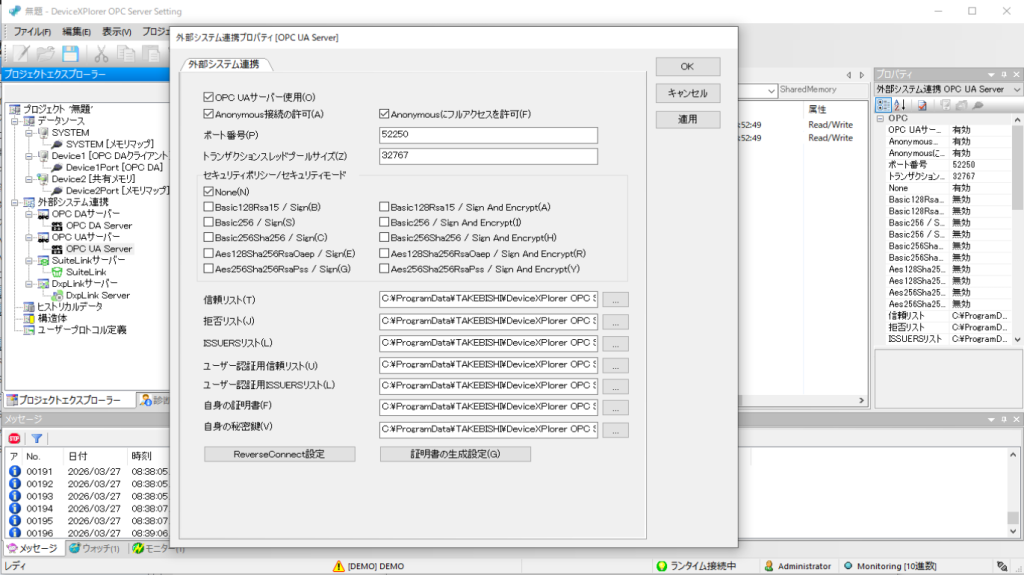 | ■たけびしOPC UAサーバー(DeviceXPlorer OPC Server 7)の設定情報。(下図参照) |