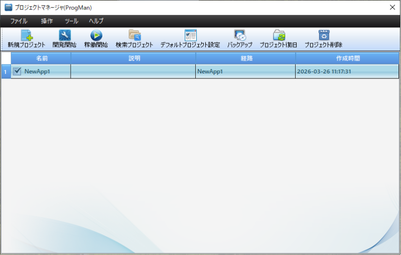 起動後、「新規プロジェクト」をクリックして、プロジェクトを作成します。(イメージは下図参照)